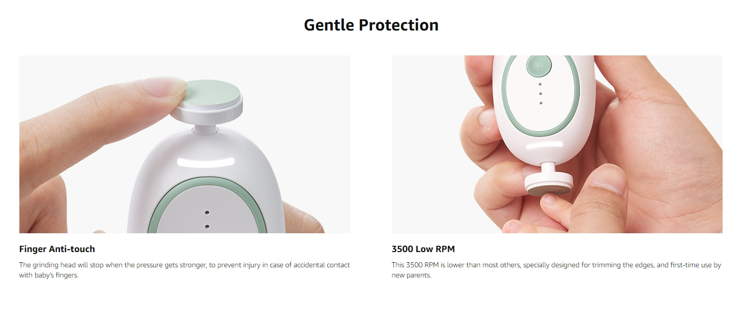 • Momcozy’s electric baby nail file features a built-in battery and charges easily with a Type-C cable, eliminating the need for battery changes.